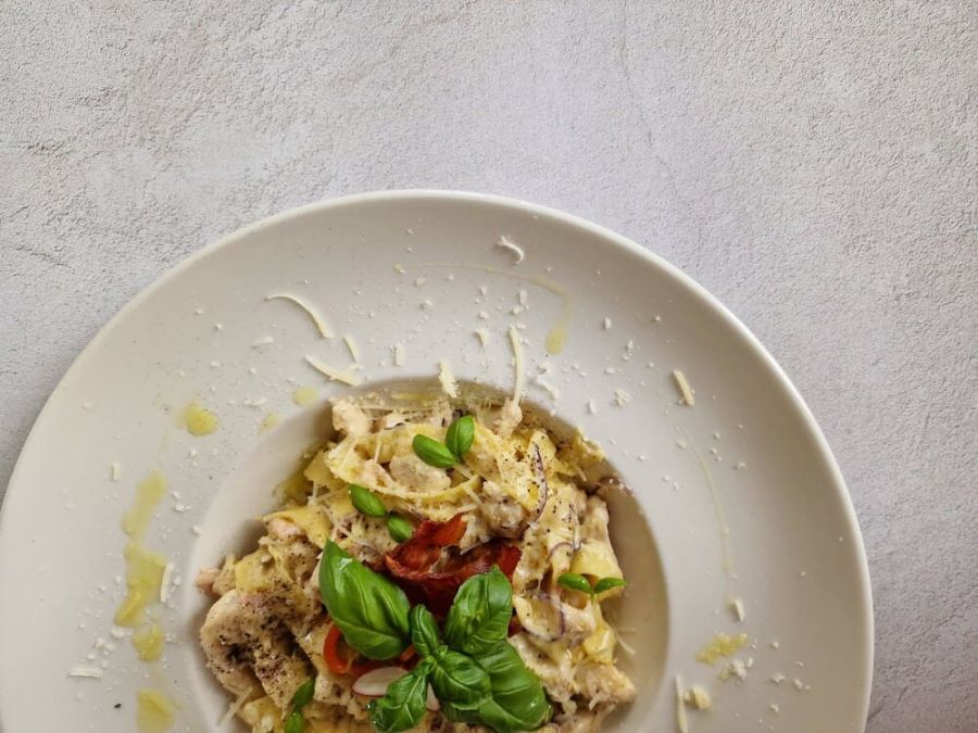 makaron | pierś z kurczaka | boczek wędzony | cebula | czosnek | śmietana | włoski ser | oliwa czosnkowa