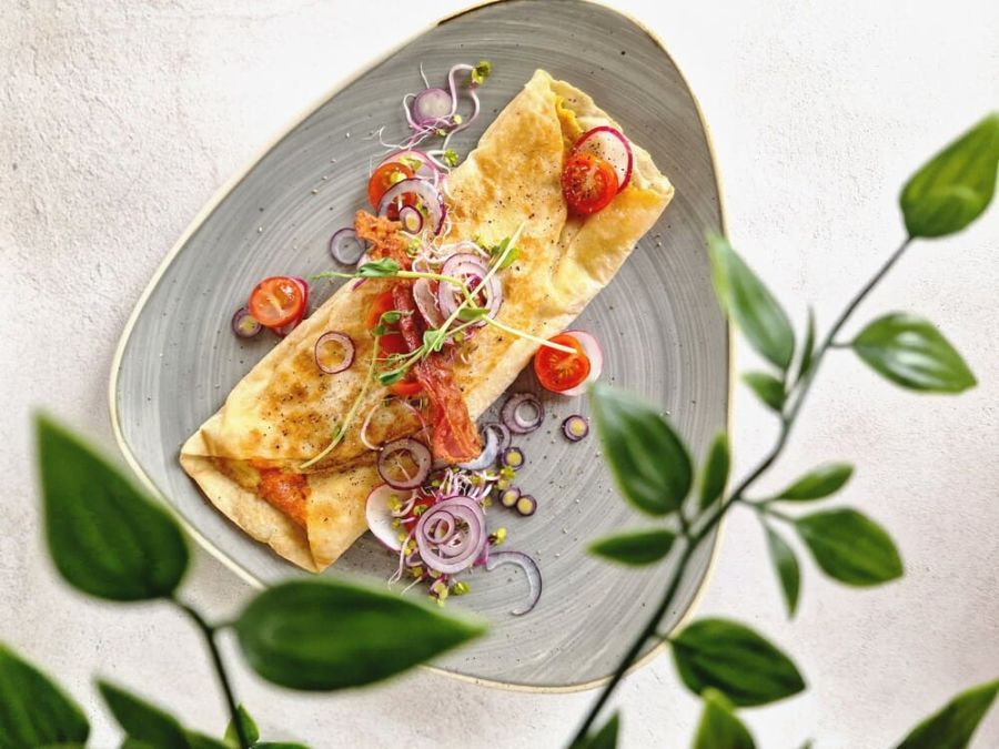 tortilla pszenna | omlet z 3 jaj | cheddar | pomidory koktajlowe | rzodkiewka | czerwona cenula