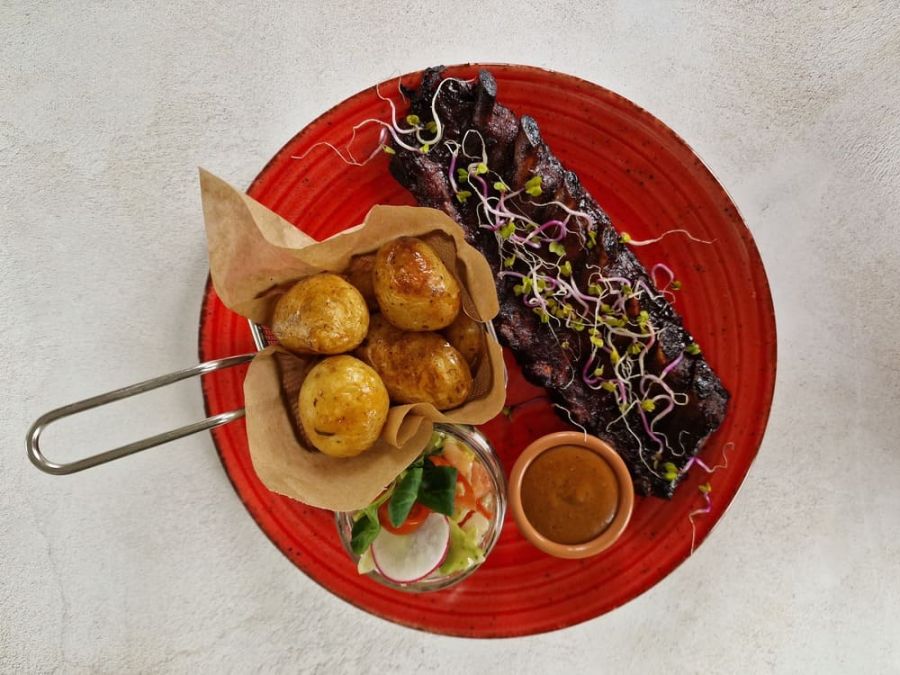 żebro BBQ | młode, pieczone ziemniaki | sałatka ze świeżych warzyw | sos bekonez