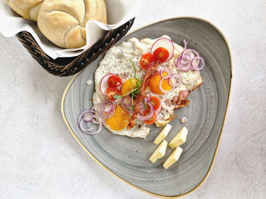 trzy wiejskie jajka sadzone | bekon | pomidory koktajlowe |rzodkiewska | kajzerki 2 szt,. | czerwona cebula